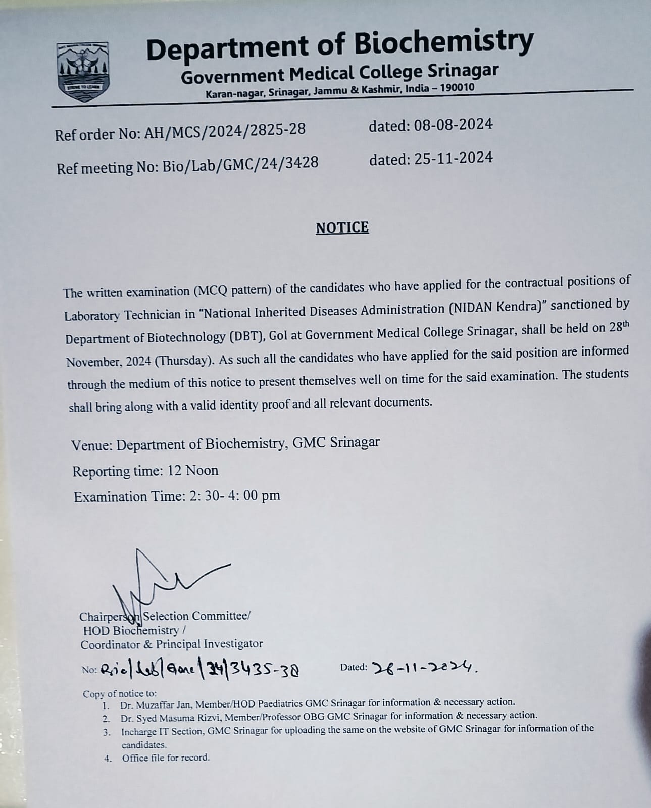 Written Examination (MCQ pattern) of the candidates who have applied for the contractual positions of Laboratory Technician in NIDAN Kendra