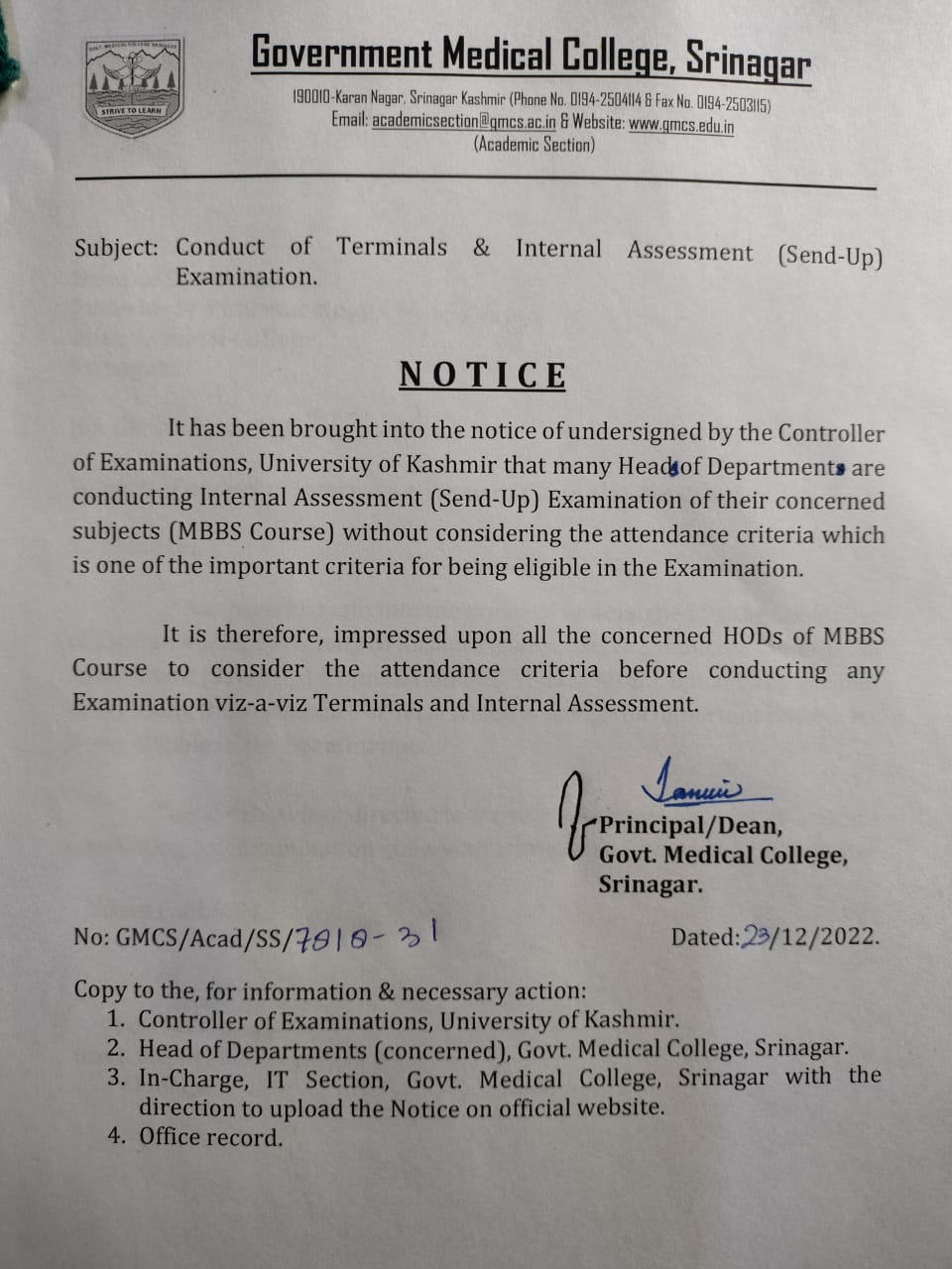Notice regarding Conduct of Terminals and Internal assessment (Send-up) examination of MBBS Courses