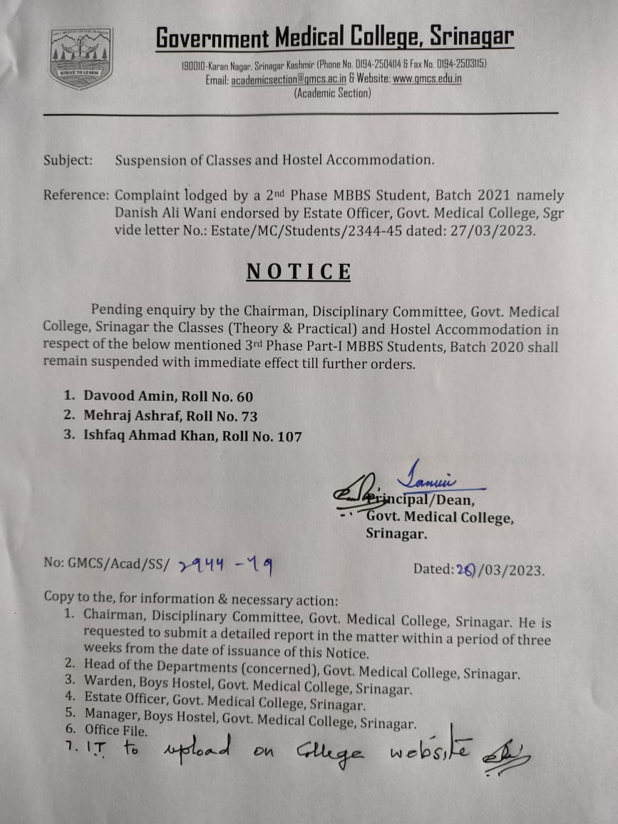 Notice regarding Suspension of Classes and Hostel Accomendations